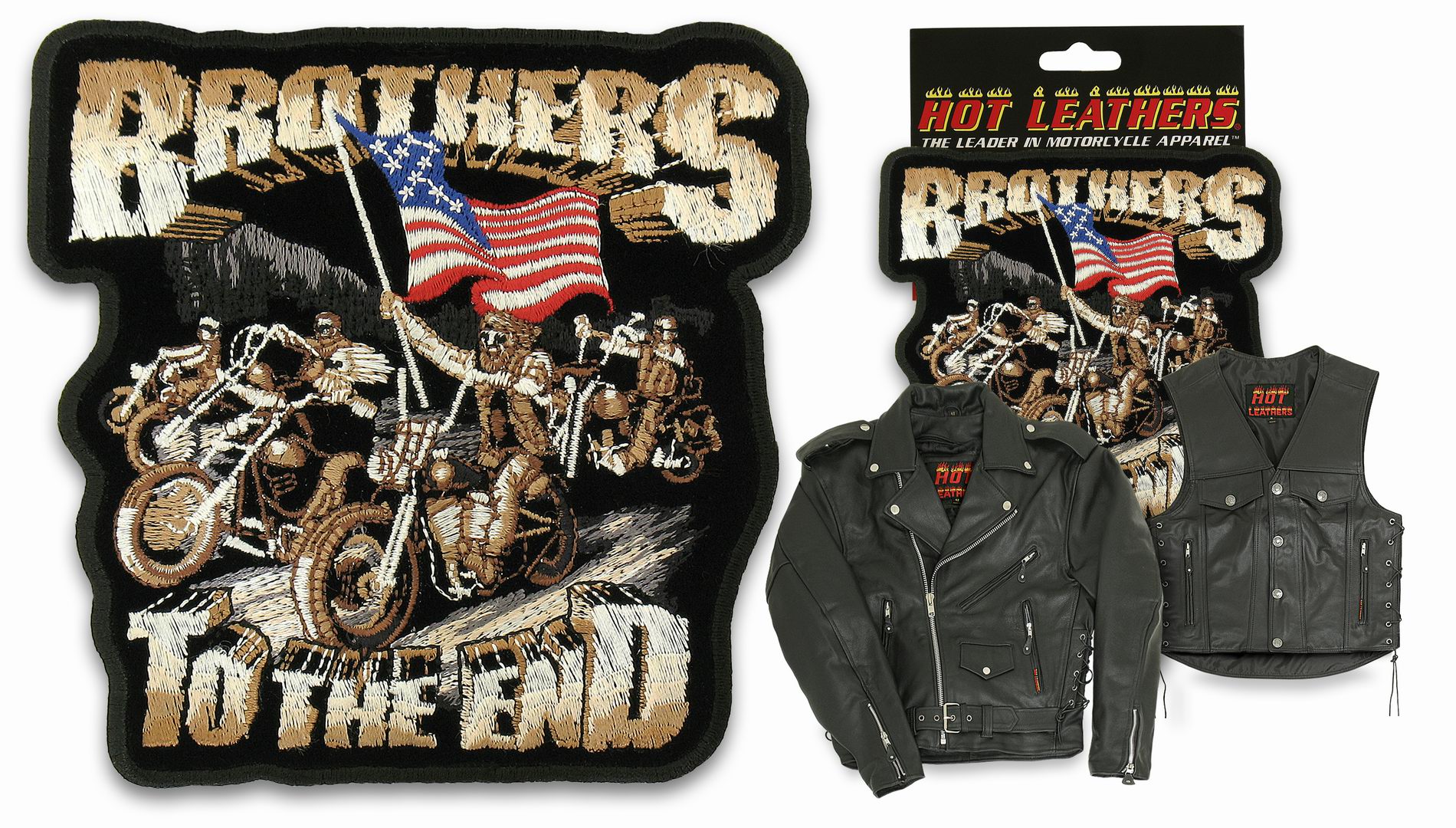 Нашивка "Brothers Til The End". На клеевой основе. Размер: 12,5 см (ширина) х 12 см (высота). Фирма-изготовитель: "Hot Leathers" ().