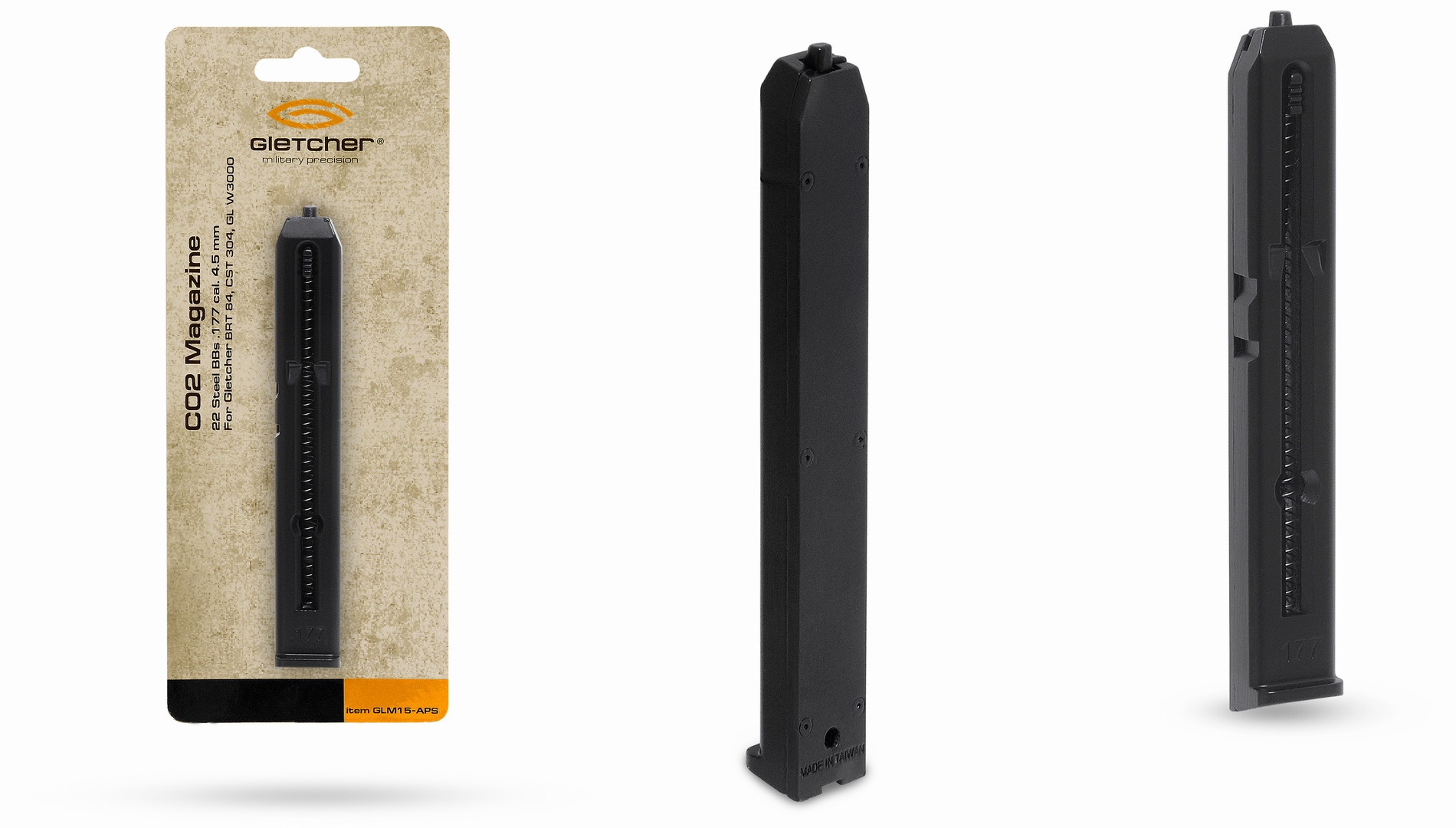 Магазин для пневматического пистолета "Gletcher BRT 84, GLW 3000". Материал: металл. Ёмкость магазина: 19 шт. Используется стальная дробь "BB" 4,5 мм. (калибр .177). Фирма-изготовитель: "Gletcher" (США).